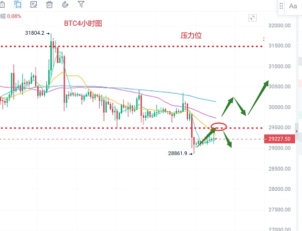 日线级别昨日收出小十字星,布林带朝下运行,受布林中轨30000压制,MACD持续放量,说明此位在持续换手吸筹,4小时级别受MA120日线的压制,布林带开口打开朝下运行,受布林下轨28700支撑。操作上建议回踩28500附近轻仓做多,目标28900-29300,上攻29800不破轻仓做空,目标29100-28400,若币价重回箱体内,则可依托29500一线布局多单,止损各350点。行情变化万千,具体操作以实时策略为主。