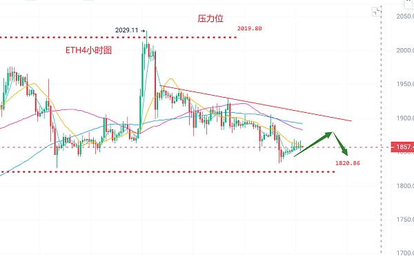 以太坊昨日高点1868附近,低点1845附近,以太昨日走小幅震荡上行走势,整体仍处于下降趋势中,短线继续联动大饼为主。