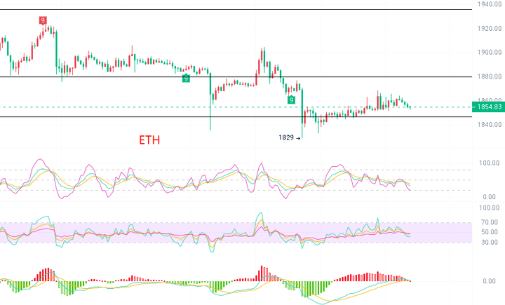 以太从4小时技术指标来看,KDJ三线拐头向下,MACD短线多头持续缩量,MA3日均线依旧呈空头形态排列,目前MA30日均线持续放量下跌,从附图指标来看空头能量柱有序排列,综合各个技术指标来看,短线操作思路依旧以区间来进行布局,看今日能否突破中轨压制,破位则继续上看1880-1900,下方支撑位关注1800附近。