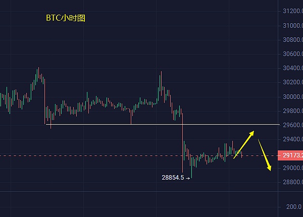 比特币,最怕的就是这种行情,前一日大涨大跌,接下来就是弱势调整,你跟他讲技术分析,他给你看心情,说到底还是谁的地盘谁说了算!比特币,昨日我们分析日线具备破位条件,第一币价强势跌破前期支撑已久的箱体结构底部支撑,第二日线通过大阴的形式有效跌破,按理说周一大阴破位,昨日顺理成章看续跌,结果昨日还是走了个震荡,并且收小阳,当然可能续跌只是时间周期问题,也有可能币价格这次下破刚好卡在第二支撑29800一线,所以短线上还是关注此位置的支撑情况吧,二次跌破下看28000关口。