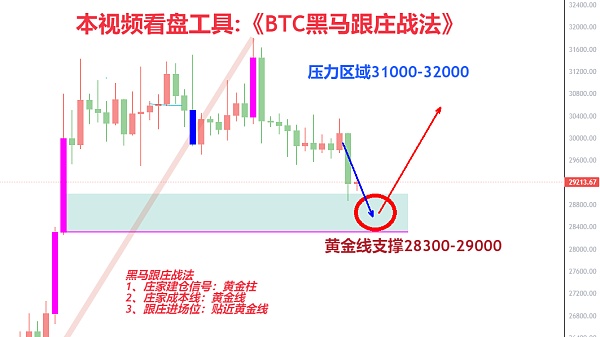 比特目前的走势还算健康,整体保持了前期的上行趋势后,短期的探底阶段,预计探底过程差不多结束了,目前这个为止应该就是短期的底部区域了,思路上还是靠近这个区域抄底,抄底区域靠近黑马量化的黄金线附近,也就是28300-29000这个区域,分批先上车!
