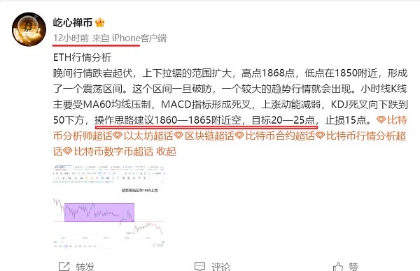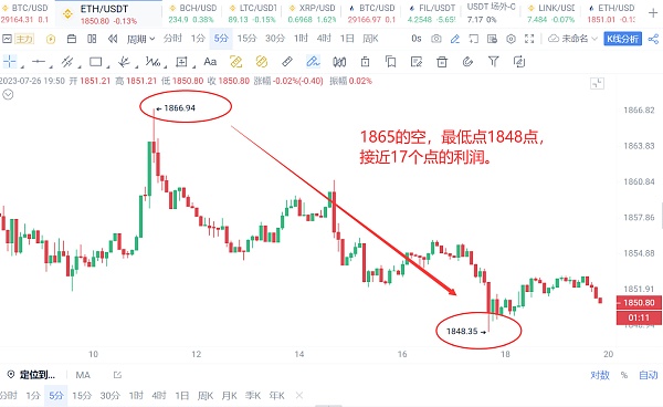 ETH今天的看空思路成功抓住最高点,截至发文最低来到1848,接近17个点利润空间,短线可以收获一波,我们晚间再战!