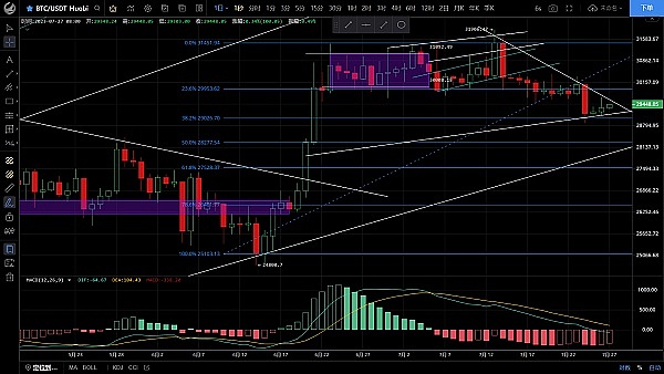 行情多次试探29000关口都未曾有效跌破,底部逐渐抬高走出冲高回落,k线收长上影由阳转阴,可见上方压制较强,macd多头逐步放量双线金叉向上运行,下方受ma7均线支撑空头未能延续,短期走势偏向多头,日线级别k线走出连阳,上方关注趋势线压制区域29600附近,日内先看反弹,随后再做高空,市场趋势偏向空头,思路建议先多后空,上方压制29600-29800,下方支撑29000-28800
