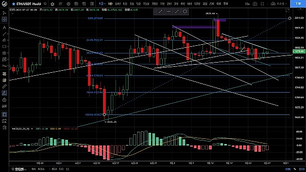 以太坊整体走势和大饼一致昨日呈震荡上行,凌晨多头发力最高触及1887一线受阻回落,恭喜跟上思路的朋友空单小幅获利,目前币价在1876附近运行,四小时级别行情虽缓慢向上运行但反弹力度过于弱势,上方有趋势线压制,多次试探都未突破,macd多头运行双线金叉状态,短期来看关注反弹力度,不破趋势线依旧看回落,日线级别走出多头排列关注日线能否收阳,副图指标空头缩量红色能量柱空心转实心,说明多头增强,上方先关注1888一线突破才会继续上行,思路建议回踩先多后空,上方压制1890-1910,下方支撑1850-1830