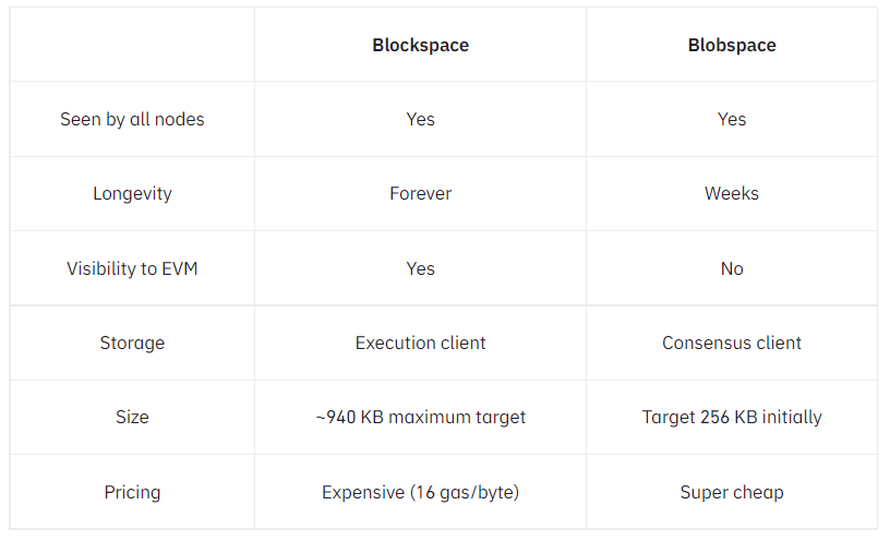 从上图的 blockspace 和 blobspace 的区别来看,blob 与以太坊虚拟机(EVM)可见的区块不同,blob 仅在短时间内可用,而对 EVM 不可见。此外,blob 位于以太坊共识层上,而不是在注重计算的执行层上。最重要的是,blobspace 比 blockspace 便宜得多。