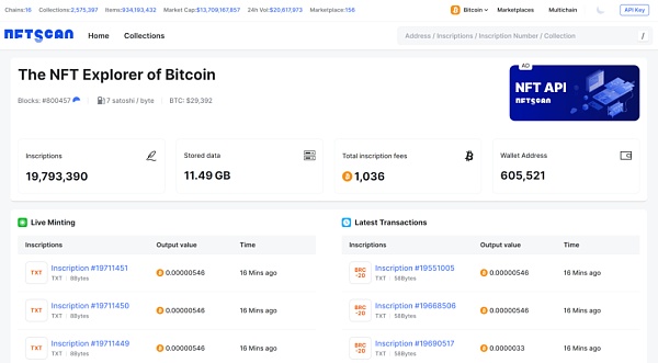 从 Ordinals 发布以来,越来越多的人开始铸造 Bitcoin NFT,就目前发展还处于早期的阶段,生态系统尚未完善,但其热度不减及数量增长十分迅速。根据 Bitcoin NFTScan 的数据显示,截止到 7 月 27 号,比特币网络上已经累计铭刻了 1979 万枚 NFT 资产,有 60.5 万个比特币钱包地址持有 NFT 资产,NFTScan 目前已经解析收录了 1534 个 Bitcoin 网络上的 NFT Collection。开发者可以基于 NFTScan 的 Bitcoin NFT API 快速创建相关应用程序,例如开发一个 NFT Marketplace 等等。