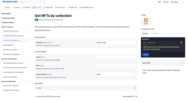 一旦在 NFTScan 的 API 文档中找到所需的 BTC API 接口和参数后,开发者可以使用选择的编程语言编写 API 请求代码。访问 NFTScan 的 API 文档,会提供以下信息: