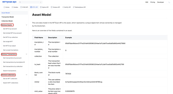 NFTScan BTC API 中的核心数据模型即为 Assets,它代表了每一个独特的数字项目,主要包括了铭文 id、铭文编号、collection 名称、tx_hash、区块 number、mint 价格、持有者等全面数据。