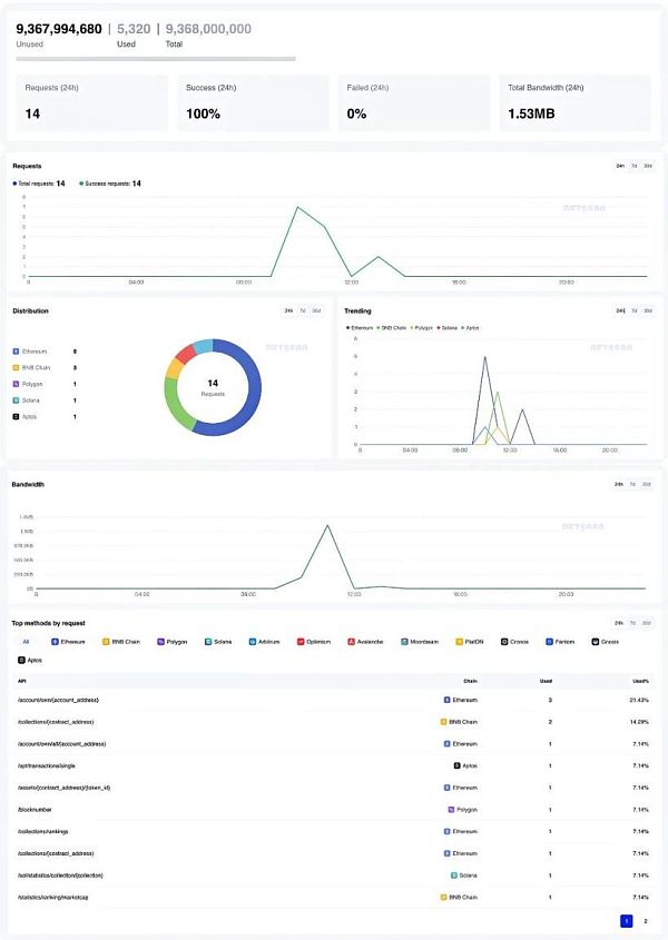 在 Dashboard 中,开发人员还可以查看自己 API 使用情况的统计数据,帮助记录历史使用数据。不仅如此,NFTScan 还为每位注册开发者提供 1M CU 的 API 调用服务,用于请求所有的 NFT API 接口,并且 CU 永不过期,用完为止!