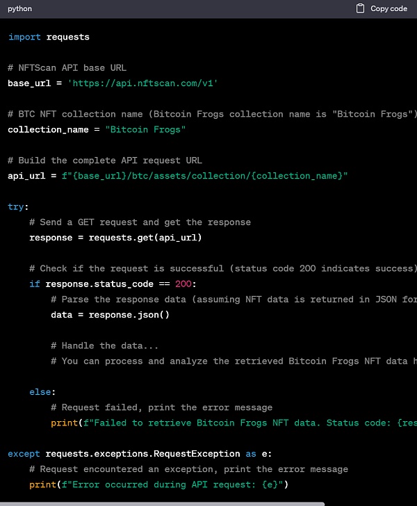 例如,构建一个请求获取 Bitcoin Frogs NFT 数据的 API 请求,查找 NFTScan BTC API 的文档或参考文档后,这里使用接口