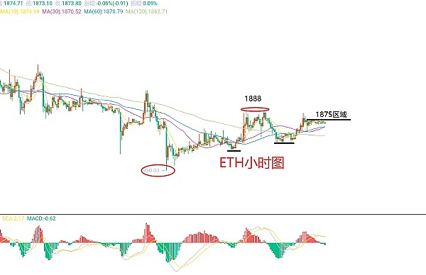 7月29日以太坊(ETH)合约技术面分析:今日方面,大周期日线级别昨日报收小阳线,K线形态上连阴单阳,整体走势处于震荡下跌走势,价格虽说在高位但反弹是没有力度的,前期高点强压力位置2030区域,在走势中高点下移,这是比较明显的信号,而当前的横盘整理也是修正的一种,低点位置1820-1630区域;短周期小时图昨日价格在美盘时间上涨压力位于1880区域附近当前回撤,K线形态连阴,附图指标死叉向下,那么日内还是有回撤需求的,因此今日ETH短线合约交易策略:现价1875区域直接空,止损1889区域,目标看1830-1820区域;