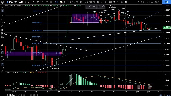 大饼昨日波动不大整体呈区间震荡,上方再次触及趋势线压制而回落,低位跌至29200一线支撑,恭喜跟上昨日思路的朋友空单获利300点,目前币价在29376附近运行,四小时级别空间逐渐变窄处于三角末端震荡,行情走势缓慢,macd多头运行双线呈金叉状态,预计会再次试探上方阻力区域,目前走势持续震荡,日线级别k线多次收上影线可见上方压制较强,多头反弹乏力,但下跌力度也不大,多空争夺激烈,大级别依旧看好空头,思路建议反弹高空为主低多为辅,上方压制29500-29800,下方支撑29000-28800