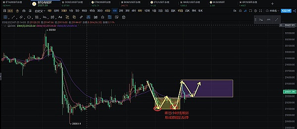 大饼前面涨势比以太要弱昨日白盘小时级别形成了一个短周期的“双底”晚间一波冲高29500后开始回踩,整体来看BTC补涨的需求还是大一些,图中可以看到BTC上方的压力位比较明显就在29500-29800