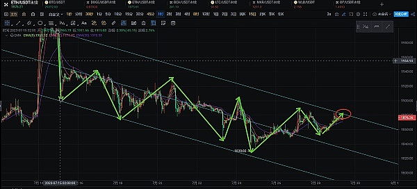 ETH小时级别从价格1830反弹至1875压力位,从图中可以看到价格已经接近通道的上轨,短期是有阻力的,不过本月月线即将收关,从月线的走势来看本月月线收阳无望。大概率还是被1880一线压制。