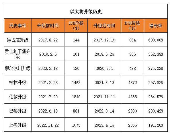 2. 以太坊:我们通过观察往期以太坊每一次升级前后的价格变化可以发现升级对ETH带来的利好。