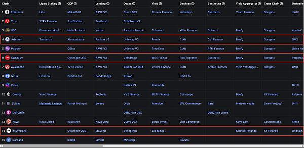包括像AAVE、DYDX、RDNT等等这种全链协议都将会迎来更大的发展空间,我们也可以通过DefiLlama看到每条链上不同板块的热门协议: