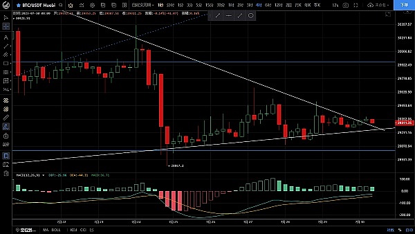 周末走势缓慢波动不大,上方触及29400附近受阻走出回落,但没有延续,上下仅200点活动空间,目前币价在29310附近运行,四小时级别底部支撑逐渐抬高同样反弹高点在降低,整体仍在三角末端震荡,ma均线缠绕,短期走势没有太大变化,依旧是震荡为主,日线级别下方支撑线未有效跌破前切勿追空,预计会先走一波反弹然后再走下跌,思路建议反弹高空为主低多为辅,上方压制29500-29800,下方支撑29000-28800
