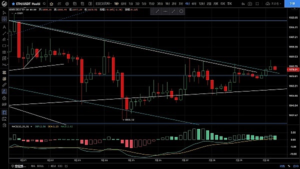 以太坊昨日多次触及1870支撑都未有效跌破,随后走出反弹,高位触及1886一线受阻回落,恭喜跟上昨日思路的朋友,目前币价在1878附近运行,四小时级别行情呈震荡上行走势,k线有效突破趋势线压制,但上行力度不强,k线收上影线说明阻力较强,多头暂时滞涨,有回落需求,日线级别k线连阳再次触及1885压制区域,macd空头逐步缩量双线聚拢,短期虽有回踩但力度不大,若1870能撑住预计会走一波反弹,思路建议反弹高空为主低多为辅,上方压制1890-1920,下方支撑1870-1840