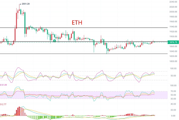 以太坊昨日价格在美盘时间上涨压力位于1880-1882区域附近,目前的K线形态也是受1890附近压力,币价回落过后,没有迎来较大的涨幅,处于一个多空博弈的状态,这个状态应该在明天会走出一个单边,毕竟来回拉扯已经进入了白热化了,很明显其他主流币种都有小幅度的拉升,周六周末波动不大,区间不破仍是以震荡行情对待。