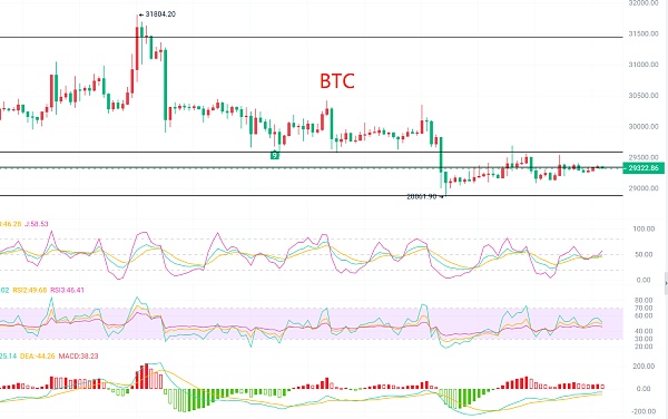 大饼昨日上下波动150点,周末行情估计还是小幅震荡,上下幅度不会太大,也是因为周末美股休市原因,比特币四小时级别空间逐渐变窄处于三角末端震荡,目前的行情走势也是极为磨炼耐心的,MACD多头双线呈金叉状态,也结合前期空头放量也到末期,那么后市还是会上攻上方压制区域,可关注前期成交密集区域29800压制位,不破依旧以震荡区间对待。