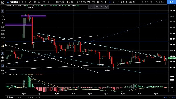 以太坊昨日再次试探1886一线承压回落,低位跌至1849一线迅速反弹,恭喜跟上昨日思路的朋友空单获利30点,目前币价在1868附近运行,四小时级别行情向下插针后迅速反弹k线收长下影,短期空头止跌,但反弹力度也不大上方压制未能突破,整体仍在区间震荡,没有明显方向,日线级别k线收阴,但趋势线支撑也比较顽强,未破前不可盲目追空,今日月线最后一天预计变盘行情这两日将到来,只要不突破横盘越久跌的越深,思路建议反弹高空为主低多为辅,上方压制1880-1910,下方支撑1850-1830
