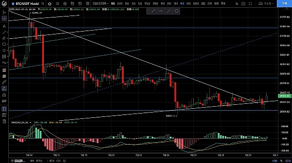 大饼昨日白盘波动不大,直到晚间走出回落冲高走势,低位跌至29037一线支撑反弹,高位触及29528附近,恭喜跟上昨日思路的朋友空单获利400点,目前币价在29436附近运行,四小时级别行情如思路一致先回踩至29000支撑附近迅速反弹,k线连阳,突破趋势线压制,macd多头运行双线金叉向上,短期走势偏向多头,上方关注29500压制情况,有效突破才会延续上行,日线级别来看空头逐步缩量底部逐渐抬高,走势和昨日思路一致短期有反弹需求,激进先多后空,上方压制29600-30000,下方支撑29200-28800