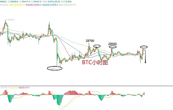 7月31日比特币(BTC)合约技术面分析:今日方面,大周期日线级别昨日报收小阴线,K线形态上单阴单阳,价格还是处于高位横盘整理,这是一直一来的规律,就是没延续性差,涨跌力度小,从而看不到破位的趋势,依旧是区间震荡之内;短周期小时图早间探底回升,价格虽说破了低点,但是没有向下延续,而反抽没有破高,但也基本抹平了跌幅,这样来说还是一直以来的延续和力度问题,当前价格反抽接近高点多次承压,再加上近期的走势规律和早间破低的结构我们今日还是要看欧盘的延续和回补,因此今日BTC短线合约交易策略:现价29450区域直接空,止损29700区域,目标看28800-28600区域;
