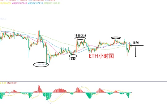 7月31日以太坊(ETH)合约技术面分析:今日方面,大周期日线级别昨日报收小阴线,K线形态上在前期连阴下跌后没有延续,而当前出现单阴单阳形态,价格处于高位横盘整理,早间价格探底回升谁说破位了前一日的低点位置但没有延续而后快速反弹,附图指标还是死叉向下运行;短周期小时图前期高点位置1888区域多次承压回撤,低点位置1855-1849-1830,当前价格在早间反抽后再次出现承压回撤,也没有破开跌口和压力位置,那么欧盘依旧要看价格回撤破低,因此今日ETH短线合约交易策略:现价1870区域直接空,止损1888区域,目标看1845-1830区域