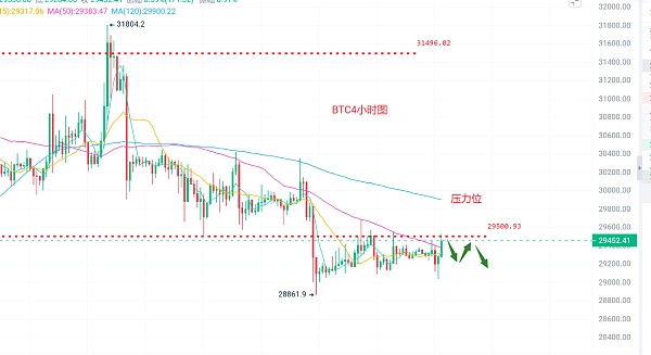 日线级别昨日收出小阴线,布林带朝下运行,受布林下轨28700支撑,MACD处在缩量中,4小时级别布林带平行运行,受布林上轨29500压制。操作上建议回踩28900附近轻仓做多,目标29300-29500,上攻29500不破轻仓做空,目标29200-28600,止损各350点。行情变化万千,具体操作以实时策略为主。