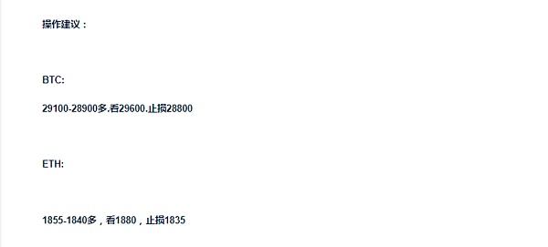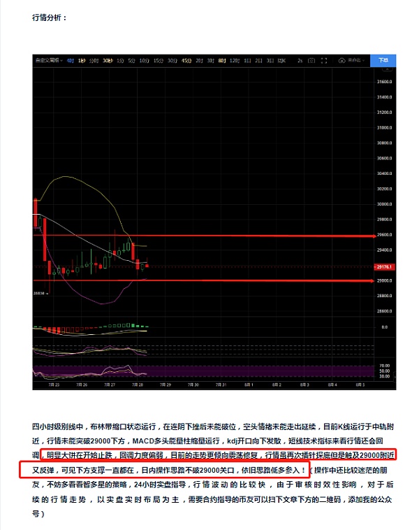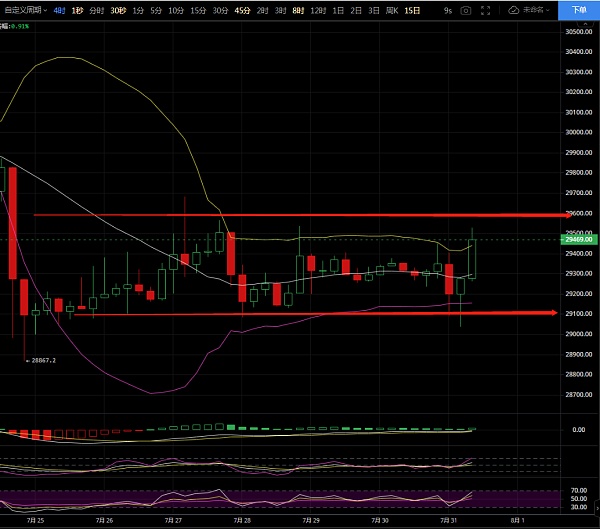 从盘面整体的走势而言,短期的走势还是偏弱的走势,目前四小时结构图来看,布林带窄幅缩口运行状态,K线阴包阳上下插针试探均未突破依旧区间来回拉锯,毫无延续性。低位的弱势结构,下方支撑则较为强烈。币价整体都是运行于29000上方。低位不能有效延续下行,还是需要关注行情的反弹力度,日内先要考虑的是低位止跌的反弹力度,其次是反弹之后的二次下跌预期,不能有效的下跌,那么在看涨幅持续,一旦涨幅形成那么续跌的可能性就较小,首先低位看反弹,在看反弹关键点的承压情况。操作建议高空低多去进行布局。