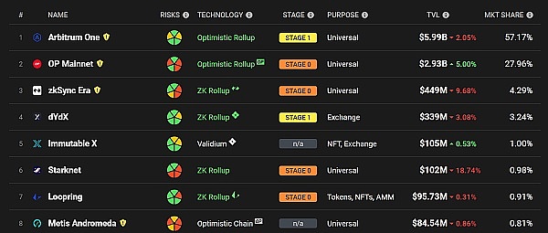 那从实现方式上来说,目前基于rollup方案的layer2项目可以分成两个阵营,分别是optimistic rollup以及zkrollup,前者最具代表性的项目是optimism和Arbitrum,后者最具代表性的项目是zksync和starknet,从整体的发展情况来看,基于optimism的layer2项目发展会更快速一些,比如目前的arb和op整体生态市值已经占据了整个layer2赛道的80%,而且生态内的项目也跑出来一些比较具有代表性的,而反观zks和starknet,目前技术层面尚不成熟,还有很多地方需要市场的验证。