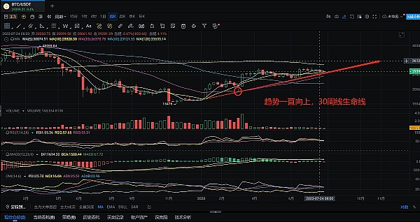 今天早上收了周线,明天会收月线。周线的话目前卡在5周线和10周线之前,所有指标都是正常的,看不出明显方向,压力位在31800,支撑位在27000附近,这个情况多空都是五五开,之前有聊过第三季度都是无聊行情,大盘没有什么期待的,主流币偶尔有些品种波动大点,看下有没有补涨的就是了,现在大家市场对美联储加息已经麻木了,很多国家的股市都是牛市了,美股目前都快破前高了,感觉这次资金布局的脚步更快了点,也不懂是不是等真到了减息,股市就会回调只是昙花一现就是,这一周多连中国股市都出现了一波行情,大家耐心等待,行情不会不来只是会迟到而已,其实我们认真看比特币我如果说已经走牛了,很多人认为瞎掰,我们从K线图可以看出,底部差不多翻倍了,趋势都是向上,只是走的很慢而已,目前看30周线是他的一个趋势线,有时候行情都是慢慢走,走三步退两步的,在半信半疑中成长的。今天就聊到这里改天再见!