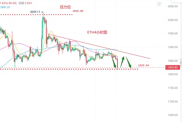 以太坊昨日高点1877附近,低点1850附近,以太联动大饼为主,走势要弱于大饼,在今日早间走了一波下跌,最低触及1816附近后开始反弹,并没有有效跌破1820支撑,目前仍处于下降趋势中。