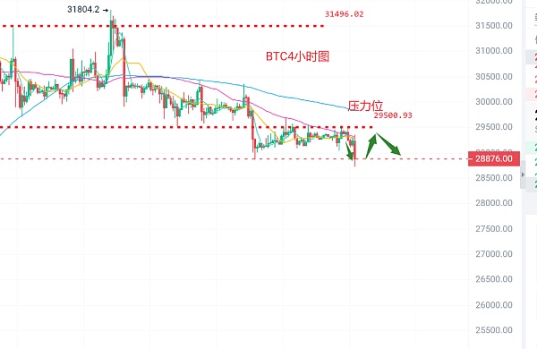 日线级别昨日收出小阴线,布林带朝下运行,受布林下轨28600支撑,MACD缩量下行,4小时级别布林带开口被打开,k线击穿布林下轨,MACD放量下行。操作上建议回踩28500附近轻仓做多,目标28900-29300,上攻29500不破轻仓做空,目标29200-28600,止损各350点。行情变化万千,具体操作以实时策略为主。