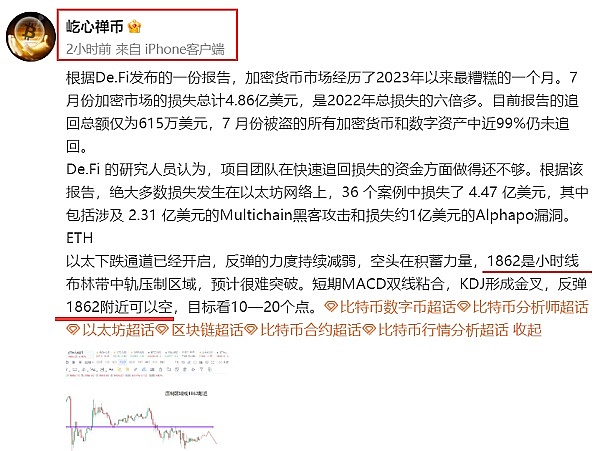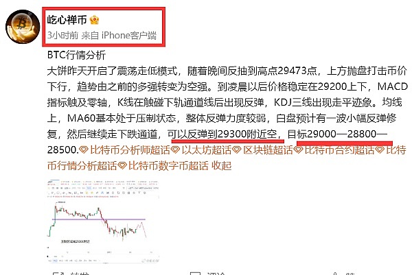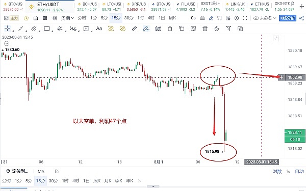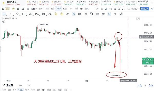 日内给出的BTC空单,29300附近空,低点来到28720,拿到近600点;ETH空单,1862空,低点来到1815,接近50点。今日操作大获全胜,有跟上的朋友吗?
