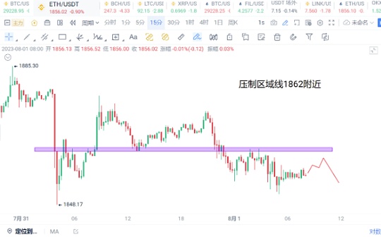 以太下跌通道已经开启,反弹的力度持续减弱,空头在积蓄力量,1862是小时线布林带中轨压制区域,预计很难突破。短期MACD双线粘合,KDJ形成金叉,反弹1862附近可以空,目标看10—20个点。