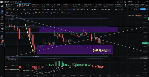 今天是八月第一天,7月是收获满满的一月,以太坊也走出了2030高点,虽然回踩了,但多空都有不错的收获,而随着行情的回踩之前长路就在文中和视频中提醒到,行情有走出2浪反弹的走势,上个交易日视频也提醒,行情可能会走出3浪回踩,行情反弹1872附近的压制,并未突破回踩1850附近获得支撑反弹。