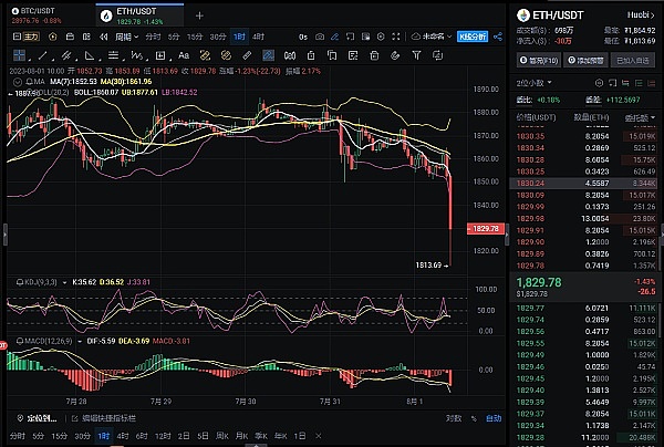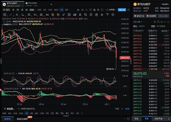 BTC:大饼早间出现较大幅度下行跌破2900关口来到28729,随后价格迎来短暂反弹回归29000附近。短期小时图上看KDJ三线即将交汇向下运行,MACD指标快慢线依旧是处于0轴下方持续向下运行,红色能量柱持续放量,同时4小时图上各指标保持空头走势不变,日内预计短期反弹若无法企稳29000一线则后续走势还是偏向空头。