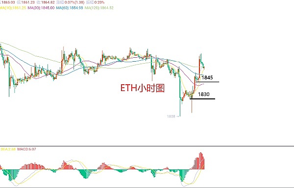 8月2日以太坊(ETH)合约技术面分析:今日方面,大周期日线级别昨日报收小阳线,K线形态上还是连阴单阳,而价格在早间的反弹走势中来到了均线上方,附图指标死叉缩量运行,昨日收线是探底回升,承压时间在美盘,反弹时间在今日早间,当前价格出现回撤修正走势,下方支撑位置关注1845区域以及1830区域;短周期小时图当前K线形态连阴,附图指标金叉缩量运行,而日内是有回撤的需求,因此今日ETH短线合约交易策略:现价1865区域空,止损1881区域,目标看1845-1830区域;下方触及1830区域多,止损放在1805区域,目标看1860-1870区域;