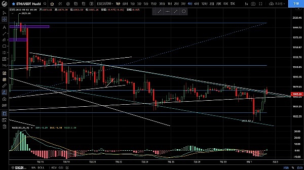 以太坊整体走势跟随大盘呈探底回升,凌晨二次下探未破前低走出反弹,高位触及1880附近承压回落,恭喜跟上昨日思路的朋友空单小幅获利,四小时级别k线连阳多头表现强势,上方触及趋势线但未能站稳,macd多头运行双线金叉状态,盘面来看多头滞涨k线收阴,短期有回踩ma7均线支撑的可能,日线级别行情仍在区间震荡,macd空头运行但没有量能双线聚拢,思路依旧未站稳1900上方前看下行回落,日内震荡的概率较大建议高空低多对待,上方压制1880-1910,下方支撑1850-1830