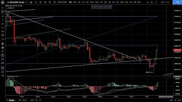 大饼昨日白盘波动不大,整体呈探底回升走势,文中高空思路获利400点,恭喜跟上的朋友,目前币价在29680附近运行,四小时级别行情破位前低后插针迅速收回,k线由阴转阳,走出三连阳强势反弹,高位触及30000关口未能有效突破,短期多头滞涨力度减弱,四小时线有机会收长上影,上方阻力较强关注回踩力度,日线级别预计会走震荡,上方关注3w关口,不突破的话依旧有下行的可能,目前整体处于29000-30000区间,思路建议高空低多对待,上方压制30000-30300,下方支撑29450-29000
