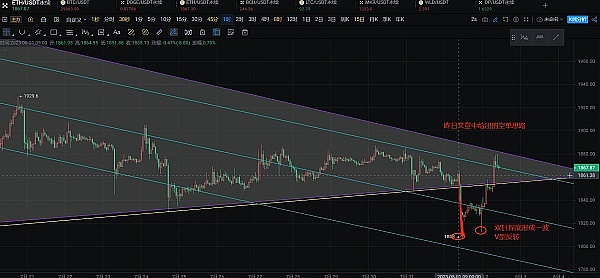 以太坊昨日上午开启一波下跌,从图中看直接跌破了三角区间的下轨,上午文章中也是给了大家一个反弹做空的思路进场区间在1862-1868 可以看到也是刚好反弹到我们的进场位,下方1830的支撑也跌破了。这一波也有50点的利润。