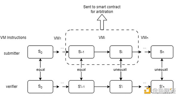 二分协议将帮助定位争议步骤,该步骤将发送到区块链上的仲裁合约