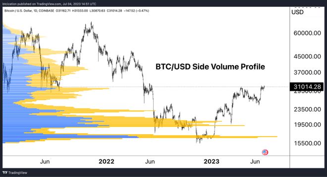 URPD 透露,在 31,000 美元以上,只有有限的供应量进行了转手,大多数交易发生在 15,000 美元至 30,000 美元之间。供应分布水平的第一个主要阻力点是 40,000 美元左右。这也与现货交易量分布以及图表的技术细分相一致。