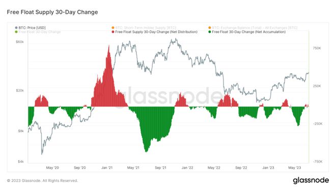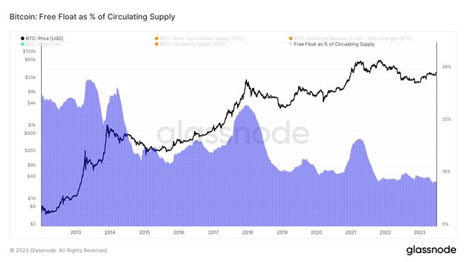 看看比特币的自由流通供应量,我们将其定义为除短期持有者供应量之外的交易所余额,当前的设置表明比特币经历了有史以来最紧张的供应状况。