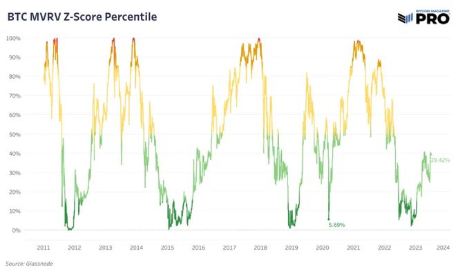 如下所示,市值与已实现价值指标描绘了一幅新生新牛市诞生的图景,估值不再处于最低水平,但仍远未相对过高,目前排名在 39%的历史读物。