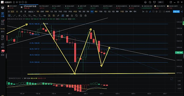以太坊行情分析:昨天以太坊反弹并未突破月线中轨的压制,跌破了周线中轨支撑,跌至1820附近获得支撑反弹,凌晨再次测试60日均线位置获得支撑发反弹,并反弹力度偏弱,并未顺利的突破上方压制,从技术面上看行情仍有继续下跌测试下方支撑的趋势,日线布林带缩口,有向下开口的趋势,昨天的大阴线将前天插针反弹的局势吃掉后,行情继续走空,今天仍要继续去关注会不会再次回踩走出3浪回踩延伸浪,若是走出,那么既有可能走出低点,下方还需要去关注1810附近的支撑,上方关注1865附近的压制。