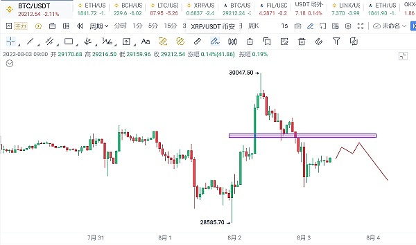 行情就像过山车,有高峰也有低谷,昨天大饼就上演了大起大落,早间行情才算平静下来,目前横盘29200附近。往上均线压制强烈,向下支撑线29600一带容易出现急反弹,29600下方刚好是日线布林带下轨区域,所以行情还需要经过多方的拉锯,形成一个方向,趋势才能走出来。小时线布林带开口已经向下打开,经过晚间的横盘,MACD指标走平,KDJ金叉向上,短期有向上拉高的需求,但日线昨日出现较大阴线,所以趋势还是空头主导,建议白盘反弹29300—29400去空,目标29000—28800.