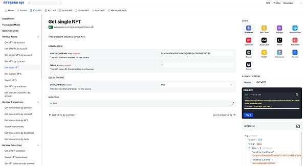 在成功注册开发者账号获取 API Key 后,您需要查看 NFTScan API 文档。API 文档包含了所有可以使用的 API 端点和参数,以及如何构建请求和处理响应的详细信息。请认真阅读 API 文档,并确保理解如何使用 API 来获取您需要的数据。NFTScan API 服务致力于帮助开发者改善获取 NFT 数据分析体验。