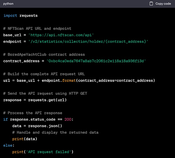 上述代码中,首先构建了完整的 API 请求 URL,其中使用了 .format() 方法来替换占位符 {contract_address} 为实际的合约地址。然后,使用 requests.get() 方法发送 HTTP GET 请求,获取 API 响应。最后,根据 API 响应的状态码判断请求是否成功,并处理响应数据。